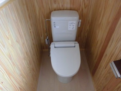【改修後】ふたつに分かれていたトイレ。 真ん中の壁を撤去してひとつにまとめ、腰掛け型の洋風便器を採用。汲取り式なので簡易水洗型のトイレで対応しています。