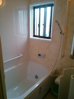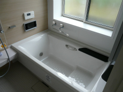 【改修後】今回は在来風呂を撤去してシステムバスを設置。 浴槽も以前のものに比べ深さが浅く高齢になってからも出入が楽。転倒防止の手すりも設置されていただきました。 浴室換気暖房機も完備して急な気温の変化で血圧が跳ね上がる事で起きるヒートショック防止も万全です。