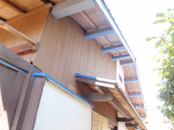 【改修前】昔の住宅の外装には使われている事の多かったプリント合板ですが、長年の内に表面が剥がれたり隙間が空いて雨水が壁の中に浸水している状態。板金部分の塗装も下地処理がされないままに塗装していた為に至るところで塗膜が剥がれていました。