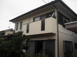 【改修前】サイディングボードにリシンを吹き付けた外壁仕様。 紫外線に依る塗装の劣化やボード同士の突合せ部分のコーキングの劣化が激しく雨水が構造体に入り込む寸前でした。ベランダ部分の防水も随分と傷んでいたのが印象的でした。