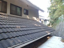 【改修前】新築当時からのカラーベスト屋根。表面も随分と痛み、苔(こけ)や汚れで随分と痛んだ状態でした。 雨樋も随分とよれてキチンと排水できていない状態です。
