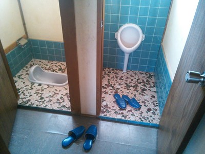 【改修前】昔、よく採用された大小が分かれたトイレ。 大便の方が和式で手すりもなく、腰や膝が悪い方が使うには少し大変。出入り口にも段差があり使い難いトイレです。