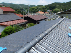 【改修後】古い瓦を下ろし、屋根垂木も損傷の大きな部分は取替え合板の重ね張りにて補強。その上に三州の陶器瓦に葺替えしました。