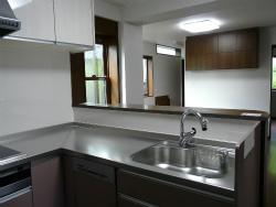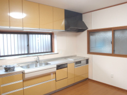 【改修後】室内の内装をリニューアルしてシステムキッチンに取替え。油の飛び散りが少ないIHヒーターに食洗機を取付て家事の負担を減らします。掃除のしやすい壁のパネルも好評でした。