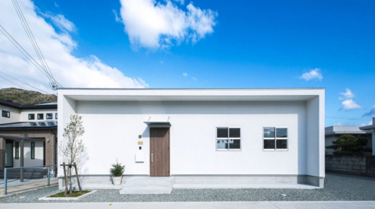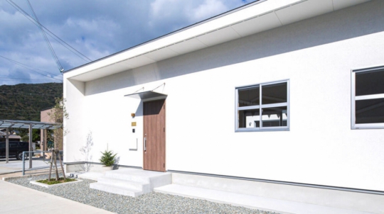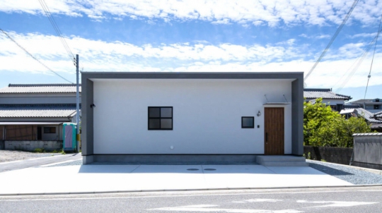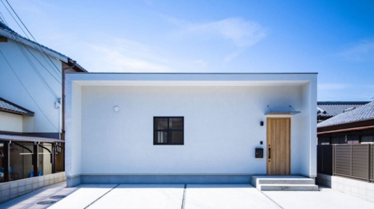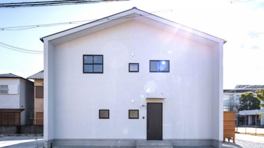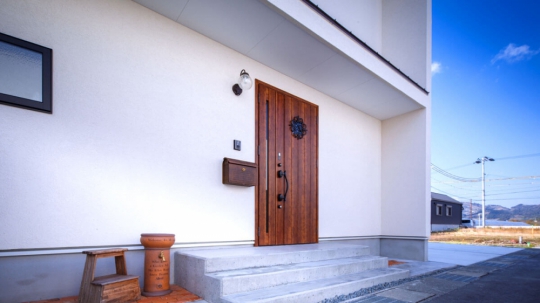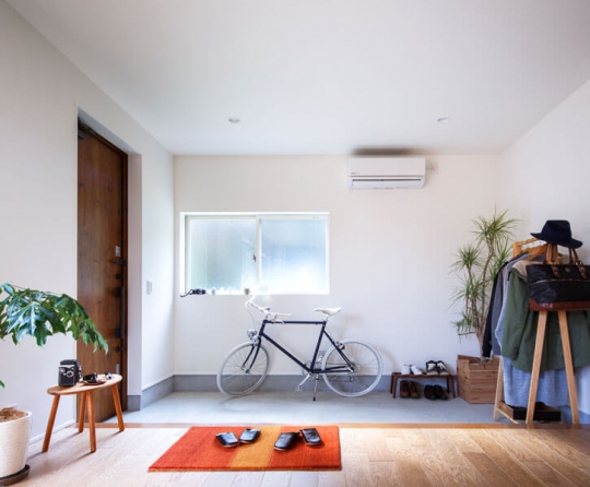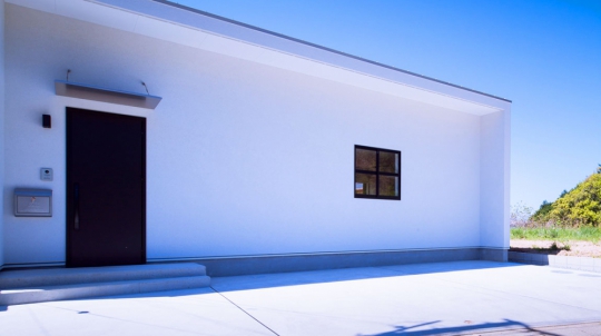 白い塗り壁の外壁と、広い土間玄関、シンプルオシャレな2階建ての家。
