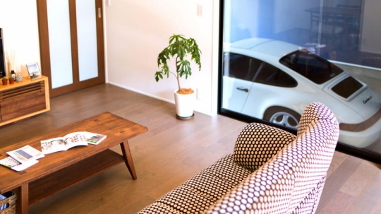 自慢の愛車をリビングから眺められるインナーガレージと中庭に池のあるL字形の平屋住宅。