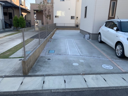 お庭の全面コンクリートの為、水勾配や排水の為に外周にスリットを入れ6号砕石を入れて浸透するようにしました。