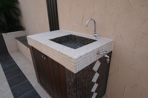 工事種類・・・タイルテラス 目隠し壁 ルーバーフェンス ベンチ 花壇 オリジナルガーデンシンク 石張り