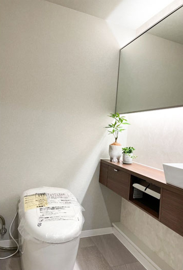 ホテルライクなラグジュアリーなトイレが完成。 タンクレスですっきりした印象のトイレとベッセル型ボウルを採用した手洗い場が高級感のある空間を演出します。
