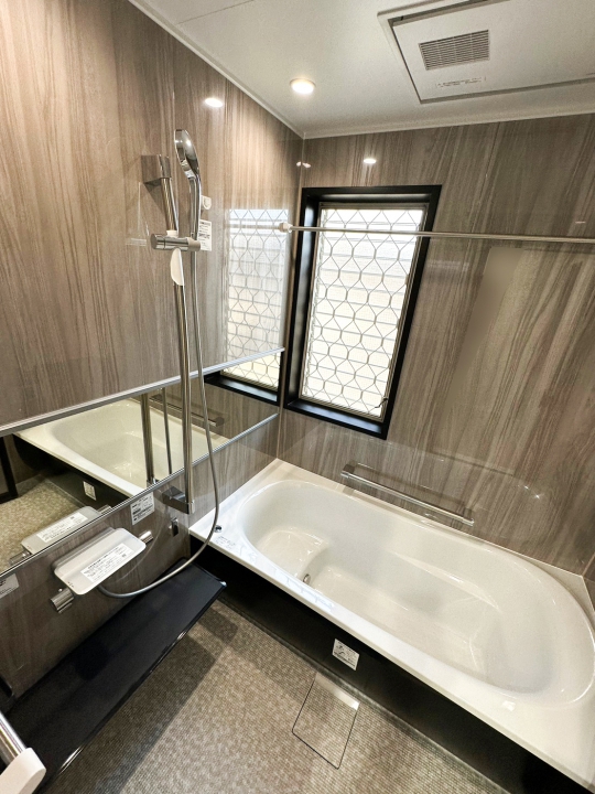 パネル(壁)にグレイッシュウォルナット(鏡面)を使用し、床はライトグレー(ラグ調)にし、落ち着いたカラーで統一。 ワンランク上のバスタイムが実現。