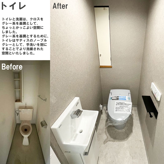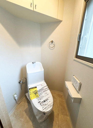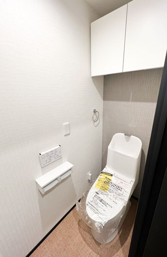 トイレはTOTOのウォシュレット一体型便器に変更し、吊戸棚を新設。収納スペースもきっちりキープしました。