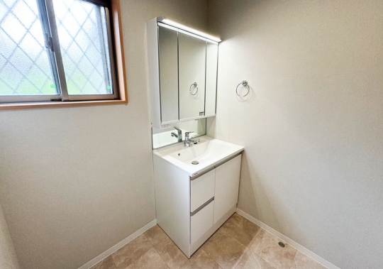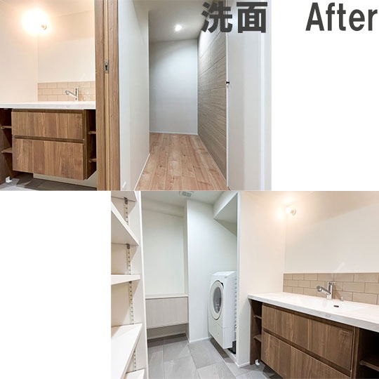 以前は洗濯機置場が洗面室の中央にありましたが、元々洗面台があった位置に洗濯機置場を変更。洗面台はサイズアップし使い勝手のよい環境になりました。