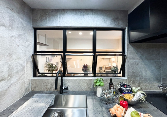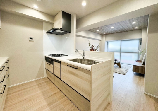 壁付L字型から対面キッチンに変更し、ベランダからの自然光が入るキッチンになりました。