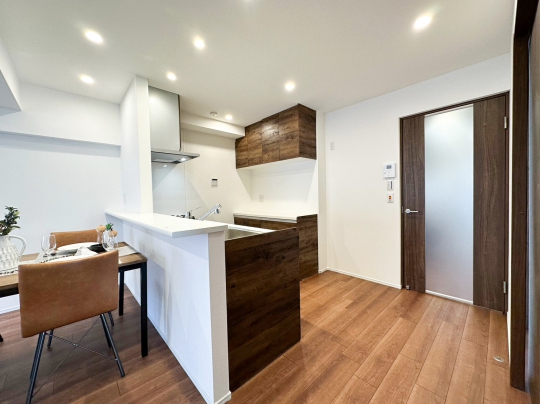 キッチンとリビングダイニングの間仕切りを取り払い、対面キッチンに変更。