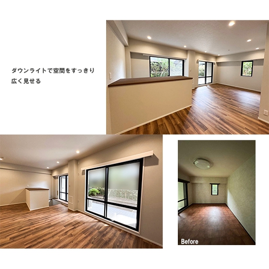 床の木目が柔らかい印象のリビングが完成。また、天井に埋め込むタイプのダウンライトに照明を変え、圧迫感がなく空間をすっきりと広く見せることができます。