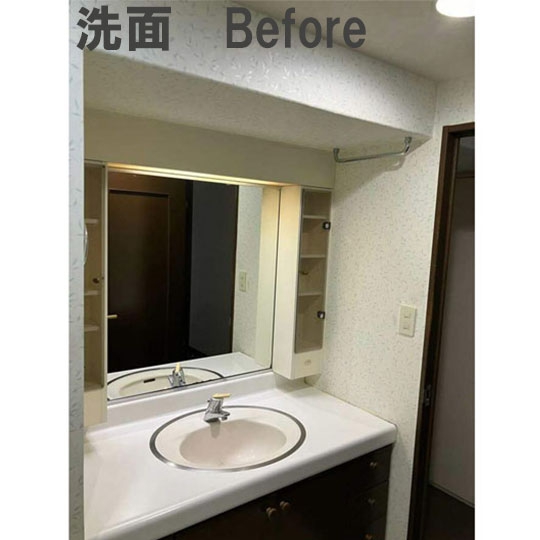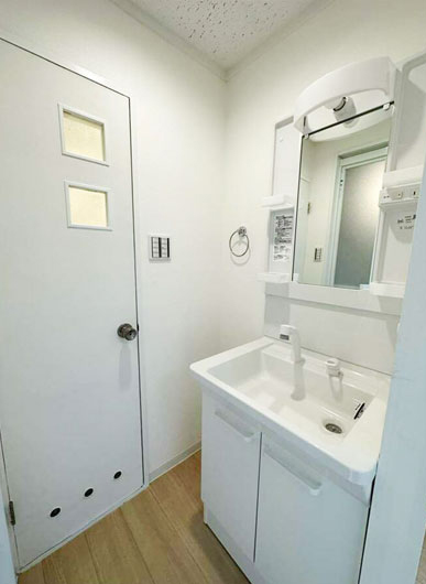 白を基調とした洗面室。洗面台横の可動棚はそのまま活かし、収納もしっかり確保した清潔感のある明るい空間に変更。