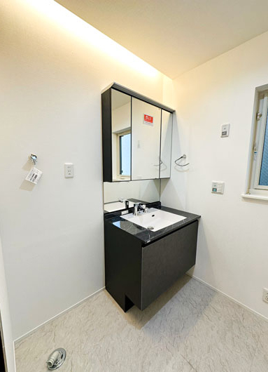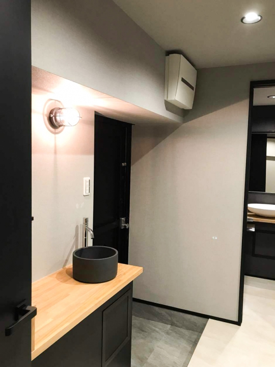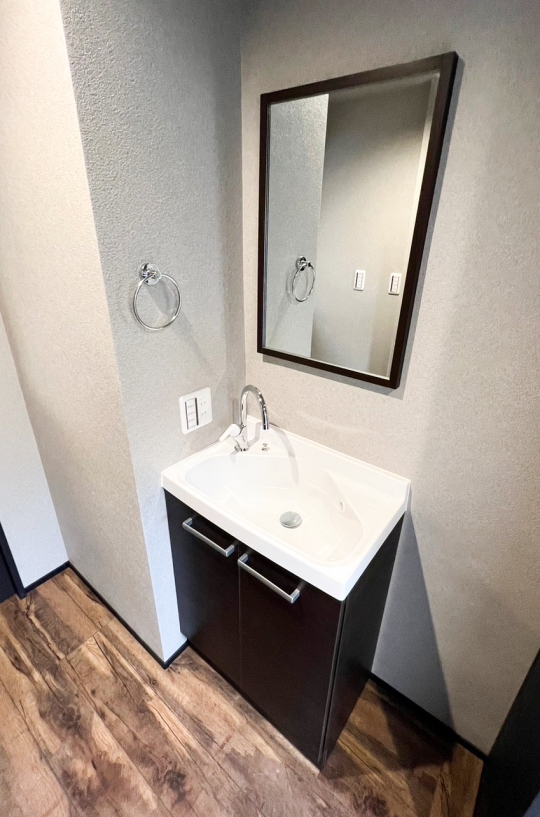 昔ながらの洗面化粧台ではなく、赤坂の都会的なイメージに似合う、グレイッシュを基調とした商品を選定しています。 シンクにはメラミン素材が使用されているため、表面硬度が高く、防水性に優れています。 見た目のおしゃれさだけではなく、お手入れのしやすさも考えています。