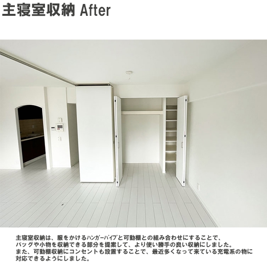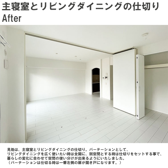 クローゼットを新設し、収納スペースを設けました。また、間仕切り上吊引き違い戸を採用し、エッチングガラスで光をやわらかく透過させ、お部屋に開放的な雰囲気の空間が作れます。引き違い戸の位置をリビング側にすることで、戸を開放するとリビングとの一体感がでて、広い空間としても使用できます。※リクシルラシッサD(ヴィンティア)間仕切り上吊引違い戸3枚建LGHグレージュエルム(エッチング)