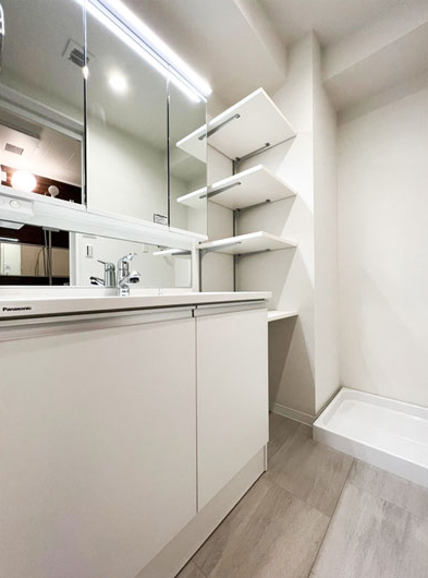 洗面台と洗濯機置場の位置を変更。 新しく可動棚を設置。 洗剤などの細々したものを収納できます。