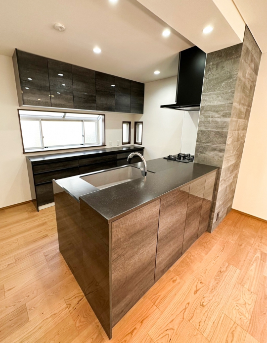 半個室だった以前のキッチンから、対面キッチンに変更。 汚れが拭き取りやすく、お手入れが簡単な扉、いつでも清潔なキッチン。(※長くお使いいただくために、やわらかい布等で優しく拭くことをお勧めします。) カラーは高級感があるダークグレーを採用。 ※LIXILシエラSフラット対面(ペニュシュラ1型)採用…3つ口ガラストップガスコンロ※水なし両面焼きグリル、浄水器蛇口一体型、食器洗い乾燥機あり
