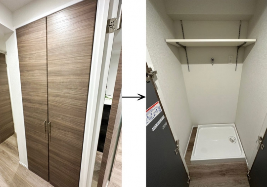 元々あった洗濯機置場を廊下に移設。扉を閉めれば生活感が出ず、すっきりした印象になります。可動棚を設置しているので、洗剤などの細々としたものも収納可能です。