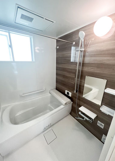 アクセントパネルをブラウン系の落ち着いたカラーにし、その他のカラーはホワイトで統一。シンプルで落ち着いたバスルームでゆっくりと温まるリラックスタイムが実現します。