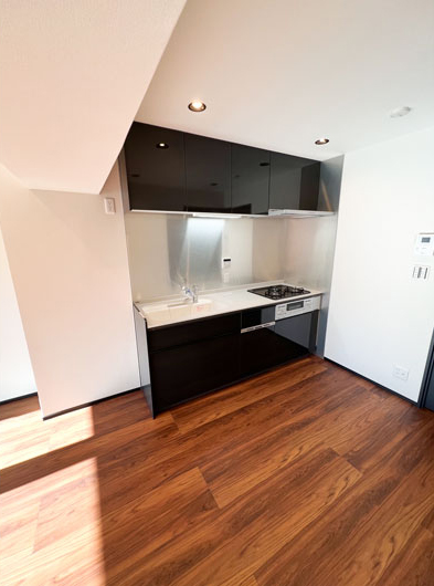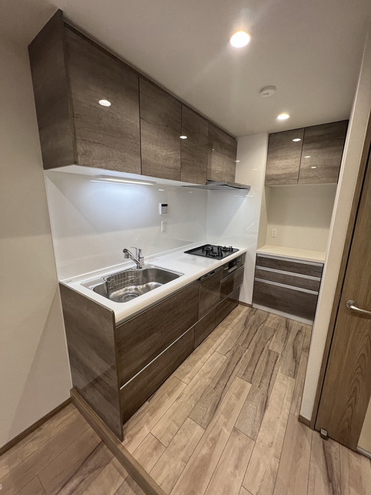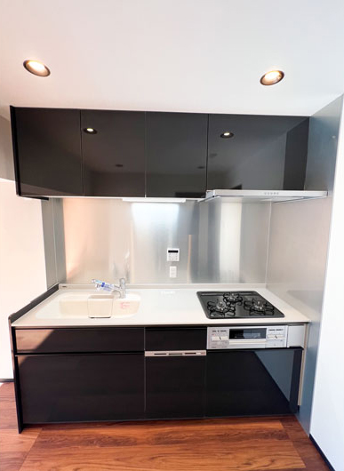部屋に統一感をもたせ、様々なスタイルを実現し部屋の魅力を高めるクリナップのコンパクトキッチン「コルティ」を採用。 ※3つ口ホーローガスコンロ(水なし片面焼きグリル)/浄水器蛇口一体型/レンジフードフラットスリムレンジフード/食器洗い乾燥機なし