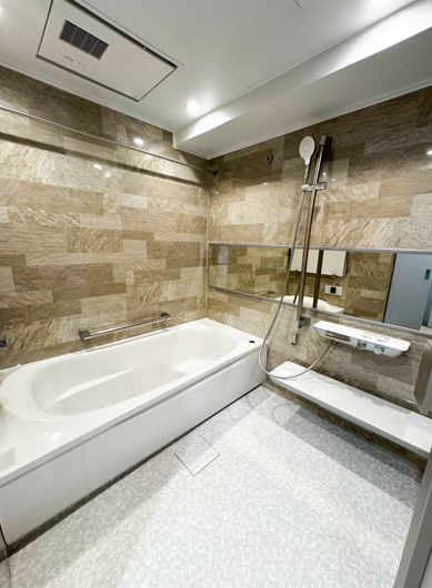 TOTOマンションリモデルWTシリーズ(1218)を採用。 以前の浴室(1116)よりサイズを大きくし、浴槽は親子で入浴してもゆったりくつろげる空間になりました。
