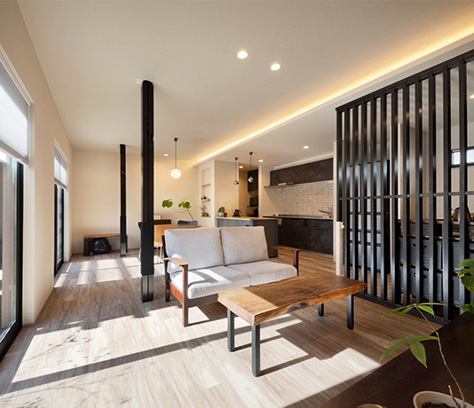 【リビング・ダイニング】一番こだわった内装は、洗練されたアーバンスタイルでコーディネート。補強用の梁も黒で塗装してアクセントに
