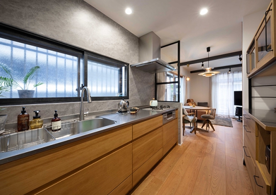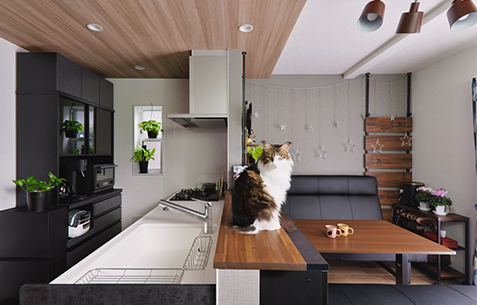 【キッチン・システムキッチン】ペットの様子に目が届きやすいよう、キッチンはL型からI型へと変更。DK内には専用スペースを設け、日々のケアもスムーズに行えます。さらに、腰高までパネル材を施工することで、引っかき傷や汚れも気にならない、手入れのしやすい室内環境を実現しました