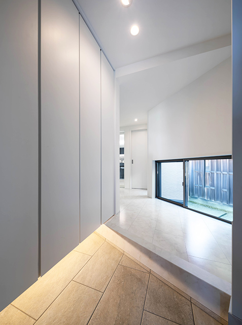【玄関】玄関には大容量の収納を設け、以前より保管できる量を増やしました。収納下の間接照明は柔らかい光で、ほっとするような落ち着きが感じられます