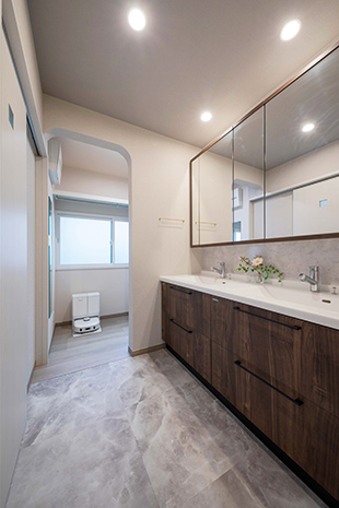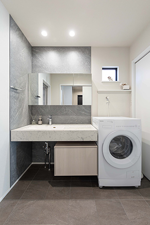 【洗面室】淡いグレーやベージュのカラーリングで、上品に仕上げた洗面室