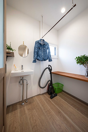 【ランドリールーム】ランドリールームは1階から2階へ移動。新設したバルコニーに隣接させることで、スムーズな洗濯動線を実現しています。シンクやカウンターも設置し、作業が完結できるスペースに