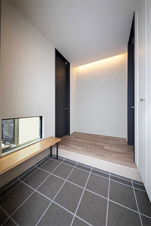 【玄関】地窓を設けて明るさを確保。壁には大谷石をイメージしたタイルを貼り、上部に間接照明を施すことで、美しい陰影を演出しました