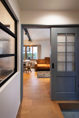 【リビング・ダイニング】ヴィンテージ風のカフェをイメージしたLDK。ラフな質感の床材、ブルーグレーの扉、ガラスの室内 窓が調和して、温かみのある雰囲気に仕上げました