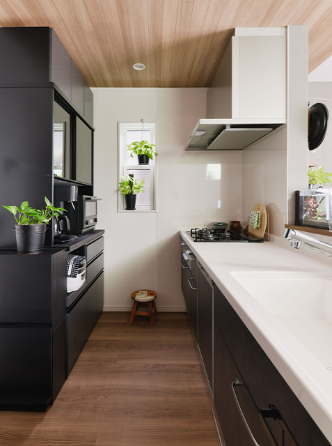 【キッチン】天井の木目がアクセントとなったキッチン。対面式のオープンタイプをセレクトし、料理をしながらリビング・ダイニングにいるお子さんを見守れる。憧れだったという広々としたカウンターは、調理や配膳がしやすいうえに、収納もたっぷりと確保