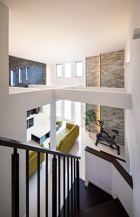【階段】吹き抜けを介して、2階もつながる。 キャットウォーク(写真中央)も新設した