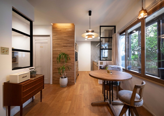 築20年のマンションにお住まいのSさま。ライフスタイルの変化をきっかけに間取りやデザインを一新したいとご相談をいただきました。希望されたのは木の質感が感じられるお住まい。和室を取り込み広がりを持たせたLDKは、和の趣きを感じる上質な空間に。床材や格子の扉、付け柱にこだわり、理想とされていた日本建築の落ち着きを演出。洋室の一部を納戸として活用し、収納力も確保。心地よく過ごせるお住まいとなりました。