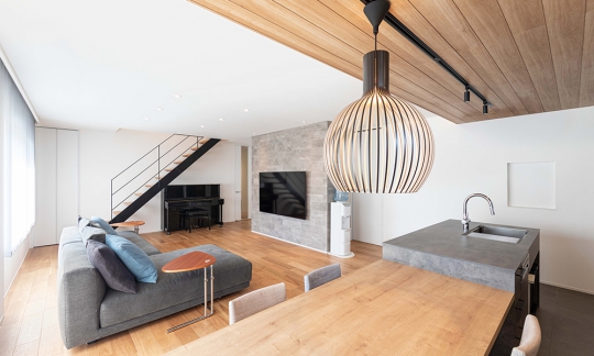 ご結婚を機に祖父母の家を引き継がれ、リフォームされたTさま。細かく仕切られていた間取りを変更し、広いLDKを実現。さらに、1階全体を回遊できる快適な生活動線も叶えました。また、リビング内にスケルトン階段を配置し、開放感とオシャレさを演出。内装はグレーと木目をベースに、間接照明をプラスして洗練された雰囲気に。デザイン性はもちろん、暮らしやすさも兼ね備えたスタイリッシュなお住まいが完成しました。
