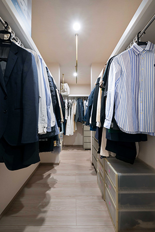 【ファミリークロゼット】LDKに隣接する水まわりは、ファミリークロゼット、洗面室、脱衣室を一直線につなげ、家事を効率的に行える動線を実現