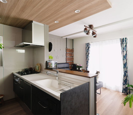 【キッチン・システムキッチン】グレーや木目を組み合わせて落ち着いた雰囲気に。LDKとキッチンの天井を同じデザインにすることで、広く伸びやかな空間を演出しています