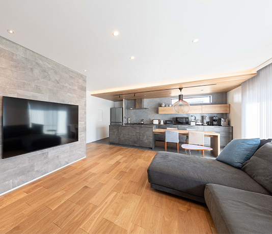 【デザイン】床材や下がり天井はオーク材を採用。落ち着いたトーンをベースに石目調のキッチンや間接照明、タイルが彩りを添えて、トレンド感のある雰囲気に