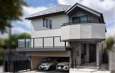 【外壁外装・屋根】内装と合わせて、外観も落ち着いたモダンスタイルに。前面に貼ったタイルが高級感を演出しています