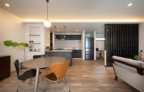 中古住宅を購入されたYさま。2階部分を取り払い、平屋にするリフォームを決意されました。間取りはLDKをメインにキッチンから水まわり、書斎、洋室、玄関とフロア全体を回遊できる動線を実現。造作の格子壁や、既存の柱を塗装し、 全体をアースカラーでまとめたことで、和の雰囲気を演出。さらに間接照明が洗練された空間を創出しています。また、ペットとの暮らしに備え、お掃除しやすく滑りにくいフロアタイルを採用。