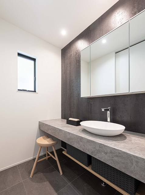 【洗面所】2階の洗面室は、グレーやブラックを基調に落ち着きあるデザインに。ワイドな洗面カウンターを設置することで、忙しい朝でも並んで使える洗面スペースになりました