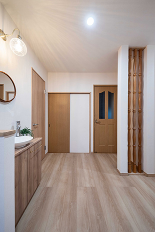 Mさまが受け継がれたご実家は築58年。耐震性や動線を改善し、安全で快適な家にされたいとのご希望。まず、標準仕様に含まれる耐震工事で耐震性能がアップ。洗面室からランドリールーム、ファミリークロゼットへと続く動線で家事がスムーズに。全体はクラシカルで上質感のあるデザインにまとめ、アーチを取り入れてやわらかさを演出。以前のお住まいの化粧格子は玄関に移設し、ご家族の想いをつなぐお住まいが完成しました。