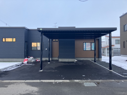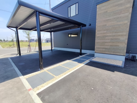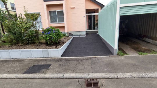 御施主様のご要望でアスファルト舗装とカーポート設置を施工させていただきました。