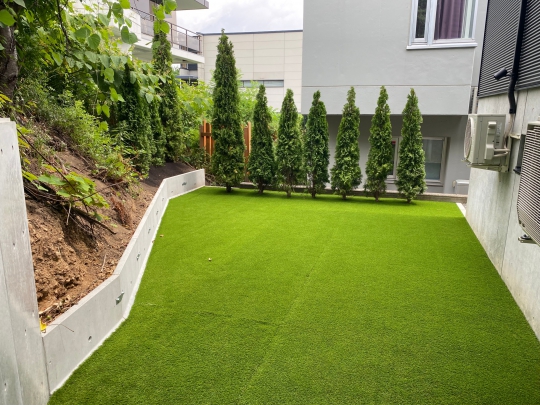 植栽周囲にL型土留め施工/アスファルト舗装/ガレージ下端に隙間板施工をし