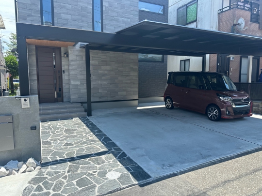 アプローチは乱形天然石 門塀は大きめのタイル 埋め込み式の宅配BOX カーポートの梁延長タイプでポリカは新色のブラックポリカです
