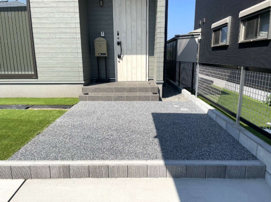 グレーの自然石舗装で統一感のある玄関アプローチ